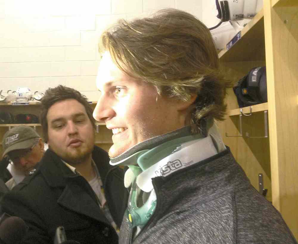 Wearing a neck brace, the 19-year-old from Michigan stood smiling on Saturday at the MTS Iceplex, signing a few autographs and answering reporters’ questions for five minutes the morning after a frightening collision with the boards.