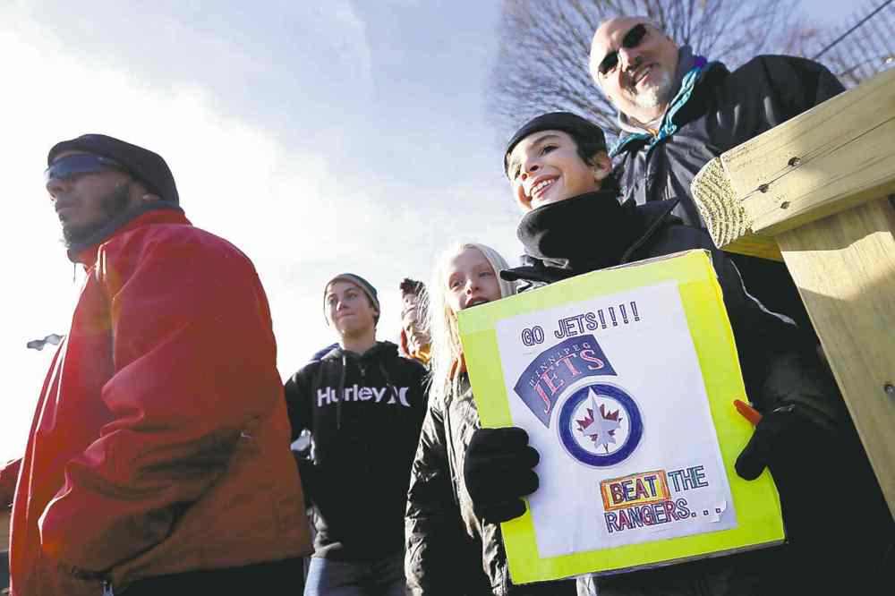 New York Islanders fan Alexander Neuhaus, 10, standing by the Central Park rink Saturday, lets it be known he wants the Jets to beat the Rangers on Monday.