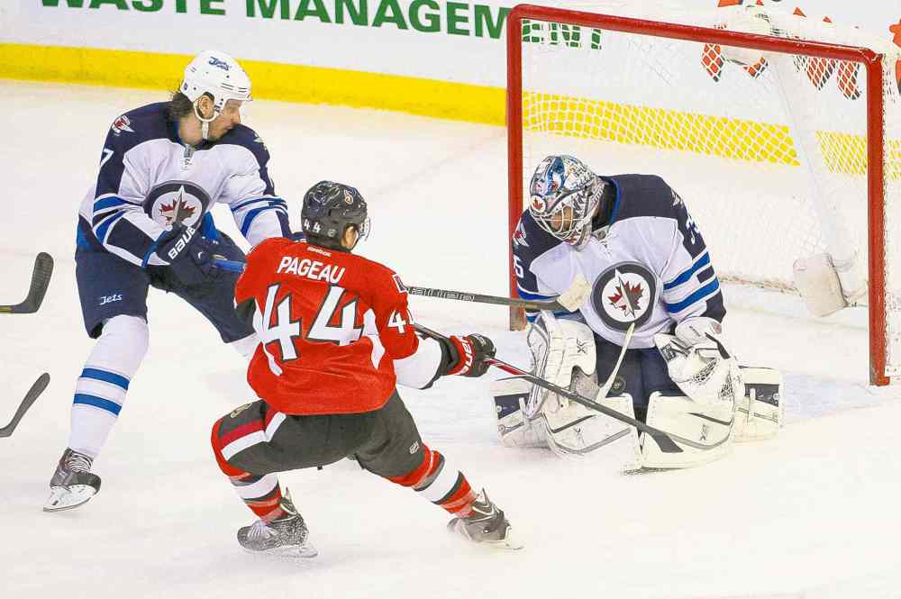 USA Today Sports Marc DesRosiers / USA TODAY Sports Senators centre Jean-Gabriel Pageau looks for a rebound after a save by Winnipeg goalie Al Montoya in the third period on Thursday night.