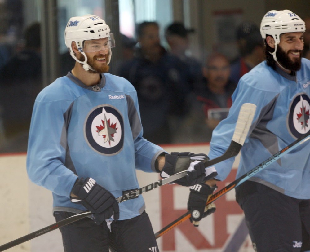 Thomas Raffl (left) and Chris Thorburn during group 01 practice at Day 1 of on-ice training camp Friday at the MTS Iceplex in Winnipeg.