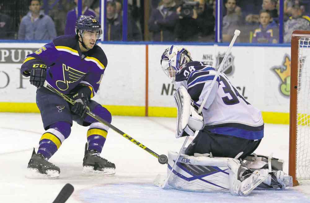 Jeff Roberson / The Associated Press Jets goalie Michael Hutchinson stops the Blues' Robby Fabbri Monday night. In a rare development of late, the goalie who started the game for the Jets finished it.