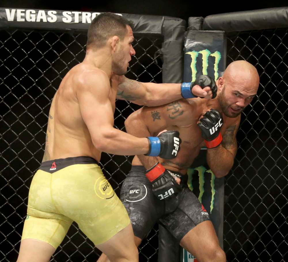 Rafael dos Anjos slugs Robbie Lawler during their welterweight bout on Saturday night.