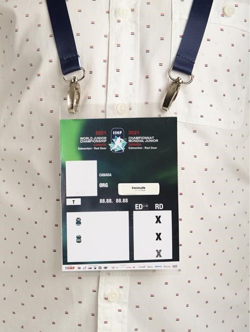 An example of a credential with the COVID-19 contact tracing technology TraceSafe is shown in this undated handout photo. What looks like a thin pack of gum is attached Braden Schneider's event credential at the world junior hockey championship in Edmonton. It's a beacon providing contact-tracing capability should the Canadian defenceman test positive for the COVID-19 virus. It also warns him if he stands to close to someone else for too long. THE CANADIAN PRESS/HO - TraceSafe MANDATORY CREDIT