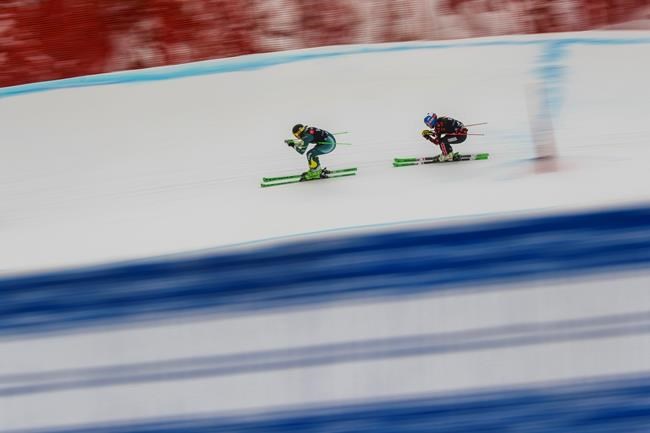 Sami Kennedy-Sim, left, of Australia, leads Mikayla Martin, right, of Canada, in practice for the women' ski cross event at the freestyle ski and snowboard world championships Saturday, Feb. 2, 2019, in Solitude, Utah. Canadian ski cross racer Mikayla Martin has died following a mountain bike accident in her hometown of Squamish, B.C. THE CANADIAN PRESS/AP/Alex Goodlett