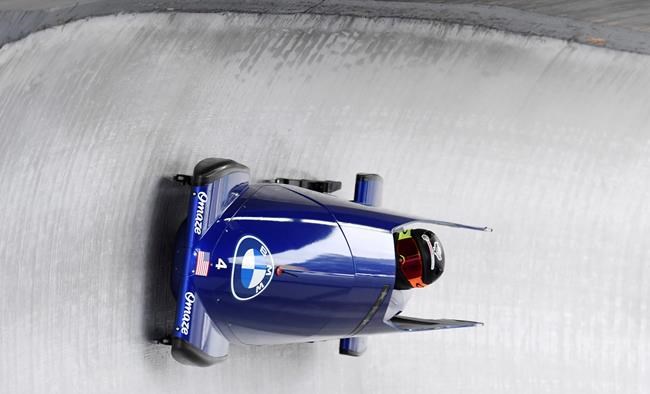 United States bobsledders Kaillie Humphries and Lauren Gibbs speed down the track during the two-women race of bobsled World Cup in Schoenau am Koenigsee, Germany, Sunday, Jan. 24, 2021. (Tobias Hase/dpa via AP)