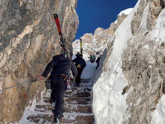 Skiers make their way to reach the start of the men's downhill course, at the alpine ski World Championships in Cortina d'Ampezzo, Italy, Friday, Feb. 12, 2021. To reach the start of the new men's downhill course in Cortina, skiers have to climb 223 steps at an altitude of 2,400 meters (8,000 feet). The course's name, Vertigine, translates to "vertigo." (AP Photo/Gabriele Facciotti)