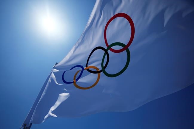 An Olympic flag flies over the top of the bleachers at Ariake Tennis Center, Monday, July 19, 2021, in Tokyo. (AP Photo/Kiichiro Sato)