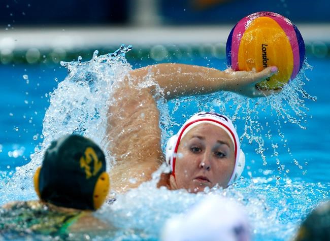 FILE - In this Aug. 7, 2012, file photo, Melissa Seidemann, right, of the United States looks to pass against Nicola Zagame of Australia during a women's semifinal water polo match at the 2012 Summer Olympics in London. The U.S. women's water polo team got a big lift when Seidemann decided to go for a third straight gold medal at the Tokyo Olympics. (AP Photo/Julio Cortez, File)