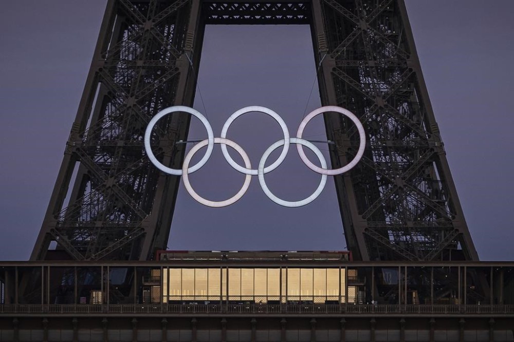 The Olympic rings were mounted to the iconic Parisian landmark on Friday to mark 50 days until the sports world gathers in the French capital for the quadrennial sports festival.