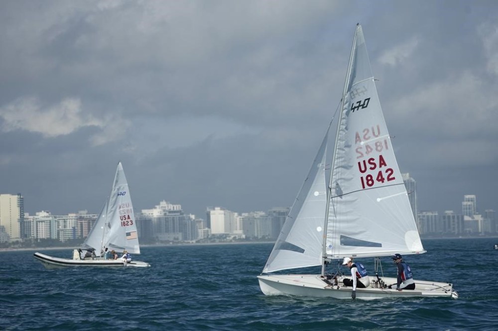 Lara Dallman-Weiss, front left, and Stu McNay prepare to campaign in the mixed-gender 470 category at U.S. Sailing Olympic Trials, off the coast of Miami Beach, Fla., Friday, Jan. 12, 2024. McNay is returning for his fifth Olympics and teaming up with Dallman-Weiss, who competed in the women's 470 in the Tokyo Games, in the new mixed-gender category. (AP Photo/Rebecca Blackwell)