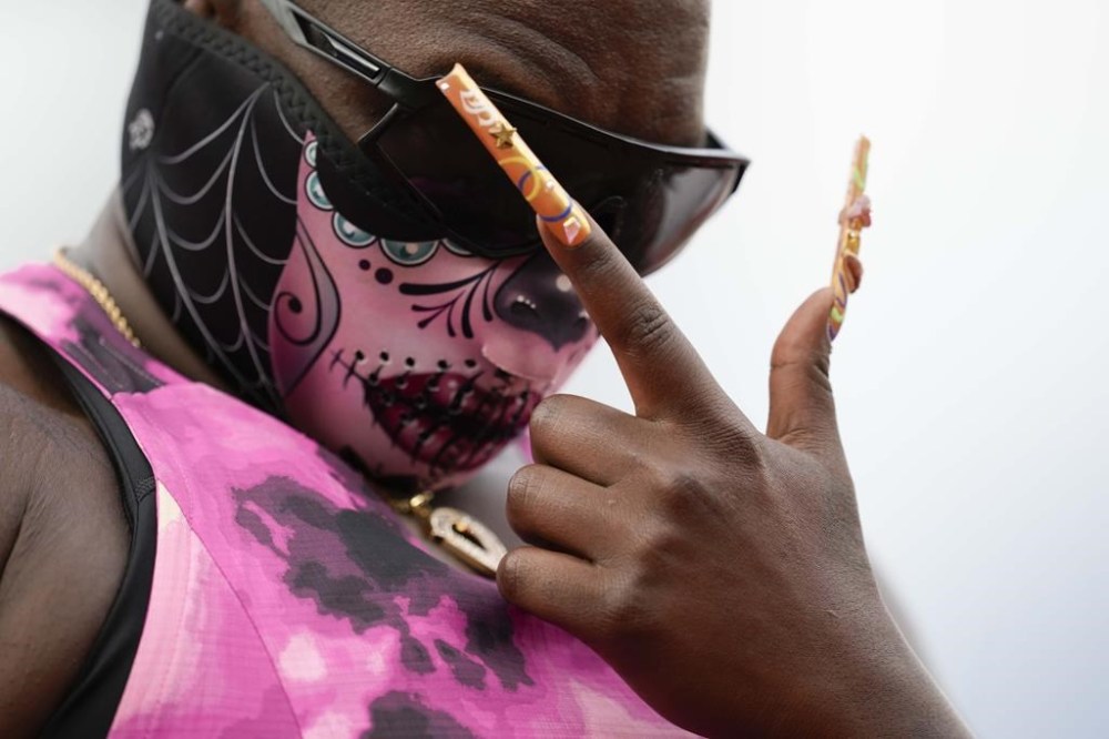 One of Saunders’ trademarks in a competition is donning a mask. Sometimes, it’s in the theme of the “Hulk.” On Saturday, it was a “Day of the Dead” sort of motif.