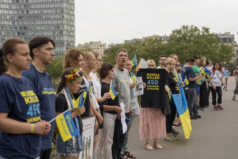 Zoriana Nevmerzhytska, 31, attended a flash mob in view of the Eiffel Tower to highlight the hundreds of Ukrainian athletes and coaches, both amateur and professional, who have been killed. Participants bore posters that read “world champions in raping,” depicting Russian soldiers, and “unmarked troops,” referring to the neutral athletes.