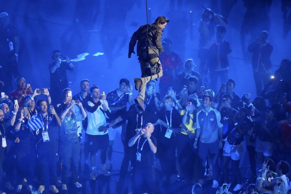 In a display of Hollywood showmanship, Tom Cruise descended from the top of the French stadium to the “Mission Impossible” theme song, shaking hands with athletes, before taking the Olympic flag from star gymnast Simone Biles, putting it on the back of motorcycle and driving out of the stadium.