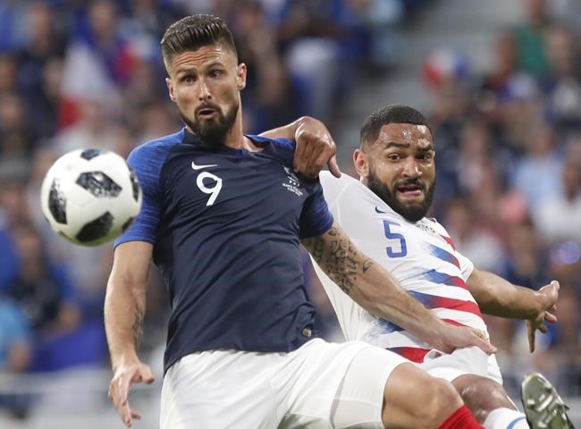 FILE - France's Olivier Giroud, left, battles for the ball with United States' Cameron Carter-Vickers during a friendly soccer match at the Groupama stadium in Decines, near Lyon, central France, June 9, 2018. Glasgow Celtic defender Carter-Vickers and Montreal midfielder Djordje Mihailovic were called in by the U.S., Friday, May 20, 2022, after being bypassed in the 14 qualifiers from September to March. (AP Photo/Laurent Cipriani, File)