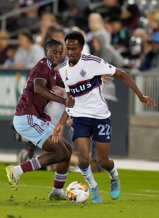 Colorado Rapids defender Moise Bombito (64) works against Vancouver Whitecaps forward Ali Ahmed (22) during the first half of an MLS soccer match Wednesday, Sept. 27, 2023, in Commerce City, Colo. (AP Photo/Jack Dempsey)