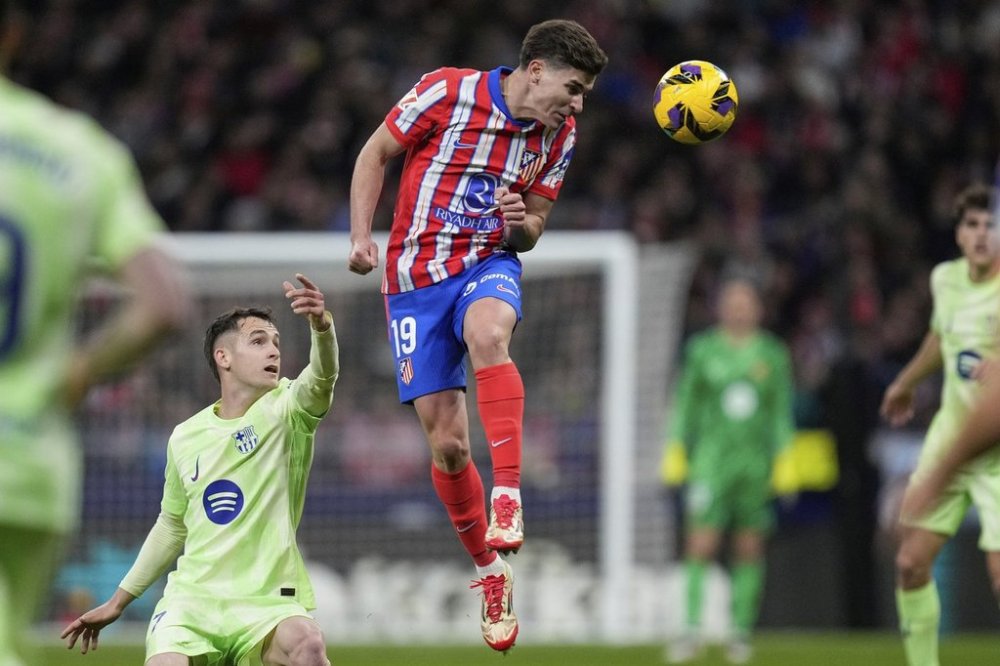 Atletico Madrid's Julian Alvarez, top, heads the ball past Barcelona's Marc Casado during a La Liga soccer match between Atletico Madrid and FC Barcelona at the Metropolitano stadium in Madrid, Sunday, March 16, 2025. (AP Photo/Bernat Armangue)