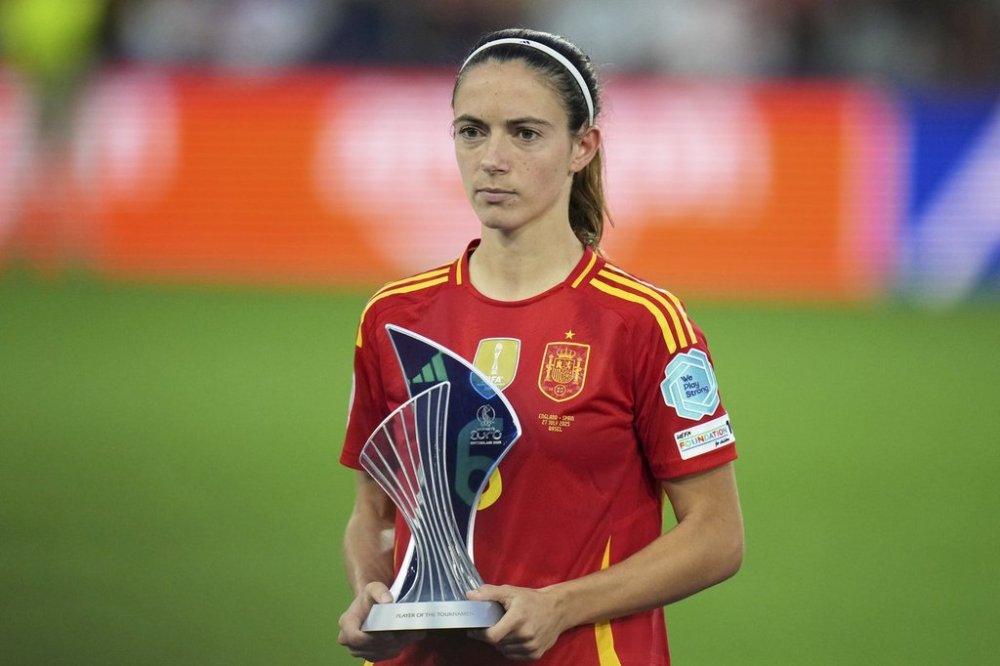Spain's Aitana Bonmati poses with the "Best Player" of the tournament award at the end of the Women's Euro 2025 final soccer match between England and Spain at St. Jakob-Park in Basel, Switzerland, Sunday, July 27, 2025. (AP Photo/Alessandra Tarantino)