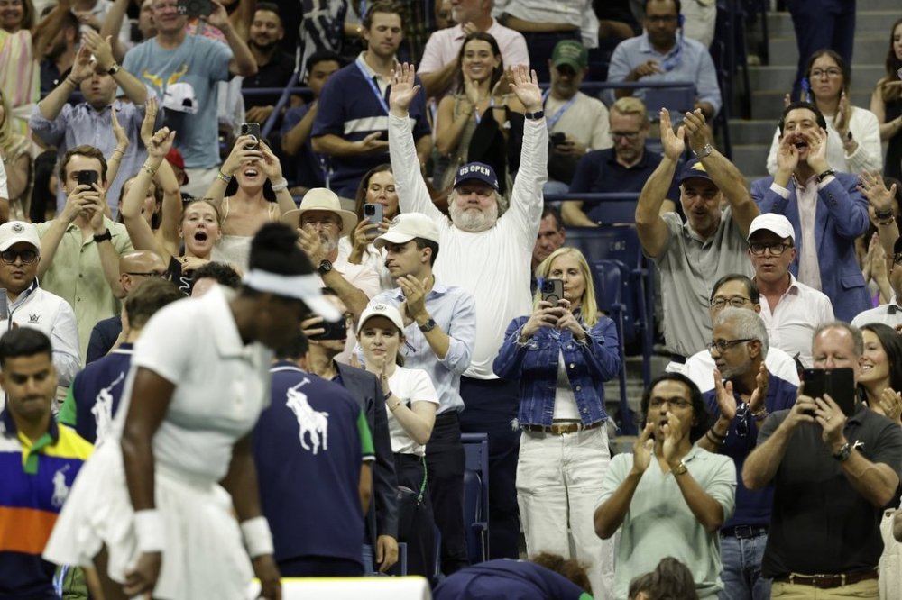 Fans cheer at Venus Williams, of the United States, wins the second set against Karolina Muchova, of the Czech Republic, during the first round of the U.S. Open tennis championships, Monday, Aug. 25, 2025, in New York. (AP Photo/Adam Hunger)