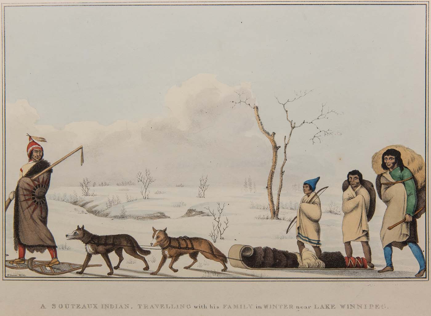 A Souteaux Indian travelling with his family in winter near Lake Winnipeg — painting by Peter Rindisbacher, circa 1825.