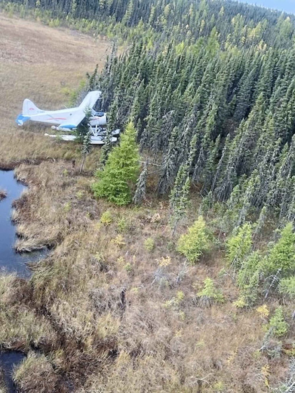 Two Mounties, along with a pilot from a private helicopter company, flew to the area and located the float plane, which had made an emergency landing in a bog.