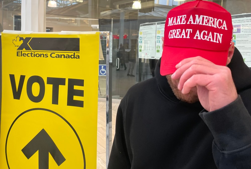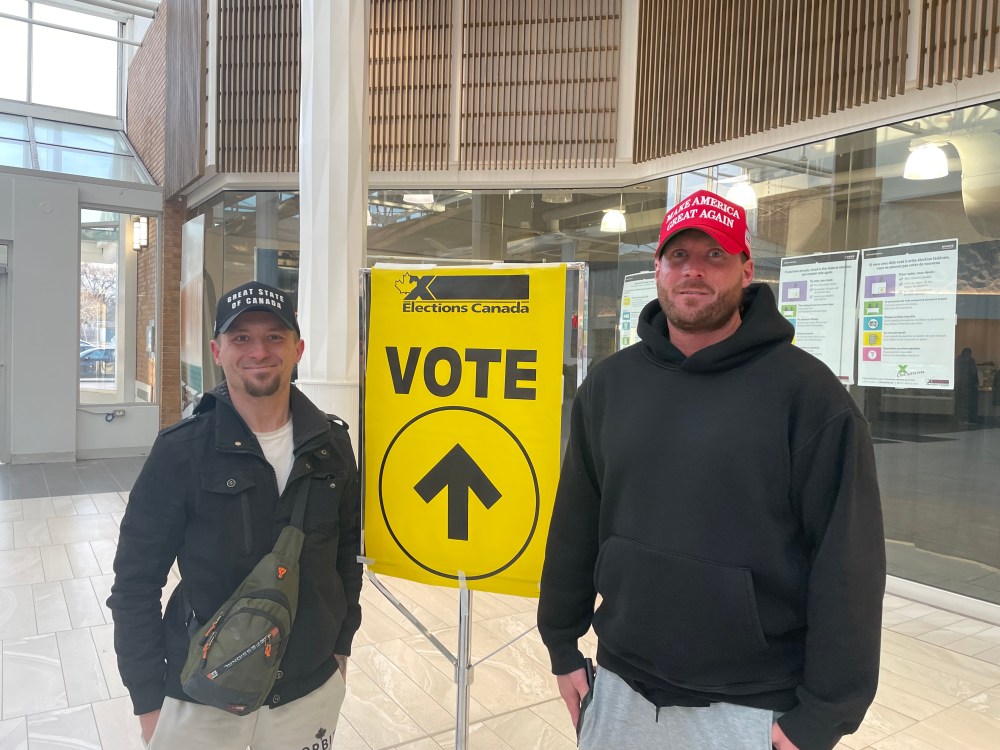 Dan Kohanchuk, 39, wore a red “Make America Great Again” baseball cap to a polling station in Garden City Shopping Centre. Simon Szklarski, 34, chose a baseball cap with “Great State of Canada” and “51” embroidered on it.