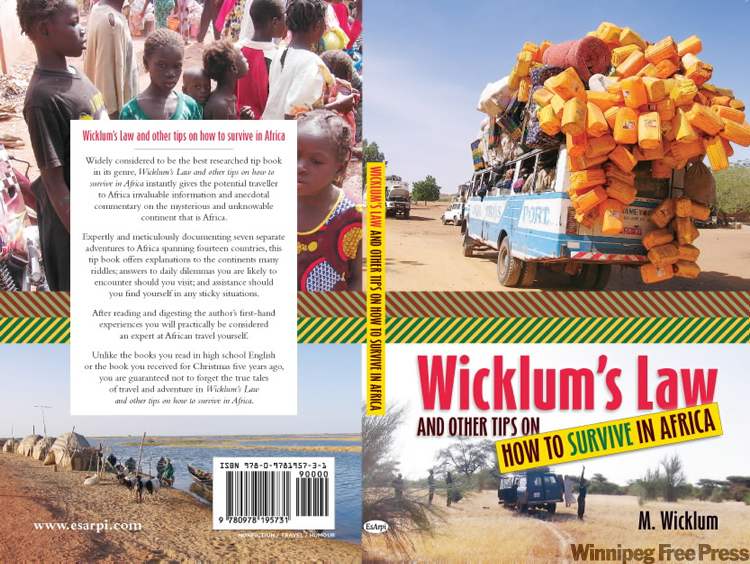 In the last few years, Wicklum has chronicled his adventures in Africa and penned a cheeky account of his travels in guide form. Just released, Wicklum’s Law and Other Tips on How to Survive in Africa (available on amazon.ca), includes such chapters as The Law of Maximums that touches on many maximums, including the maximum sickness level a person can endure (which usually happens after eating raw chicken in Namibia).