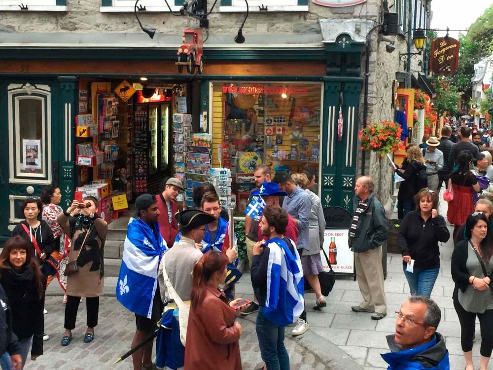 Flag-wrapped revellers celebrate Quebec’s national holiday weekend in Quebec City’s Lower Town.