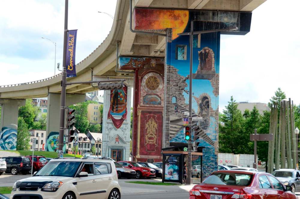 Street art under an elevated road in Quebec City, part of a neighborhood transformation meant to beautify the city.