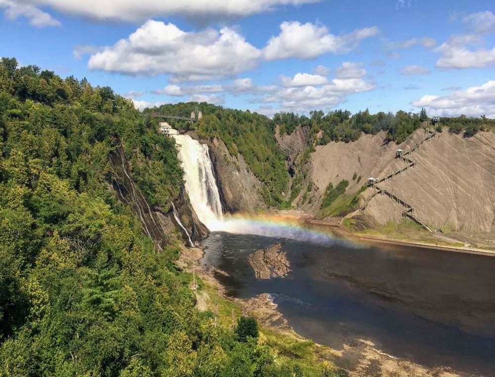 Roaring water makes a sunny-day rainbow at Montmorency Falls on the outskirts of Quebec City. Visitors can get to the footbridge atop the falls by cable car or by climbing nearly 500 steps. (Cal Woodward / Associated Press files)