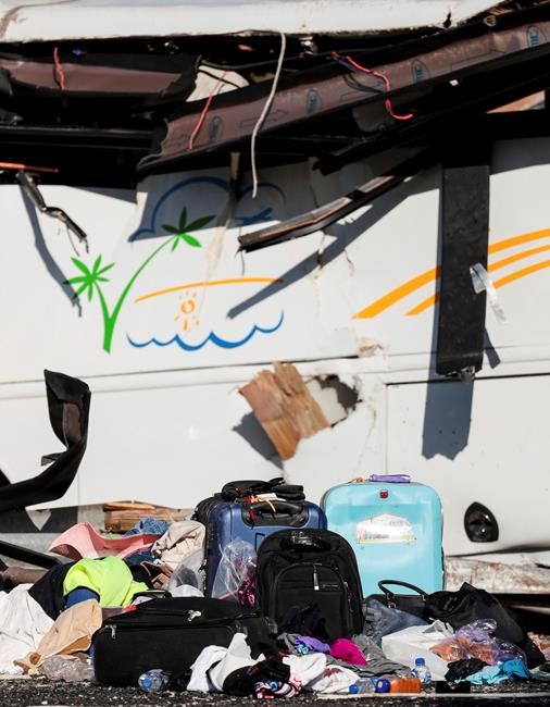 Luggage sits on the roadway at the scene where at least four people were killed in a tour bus crash near Bryce Canyon National Park, Friday, Sept. 20, 2019, in Utah. (Spenser Heaps/The Deseret News via AP)
