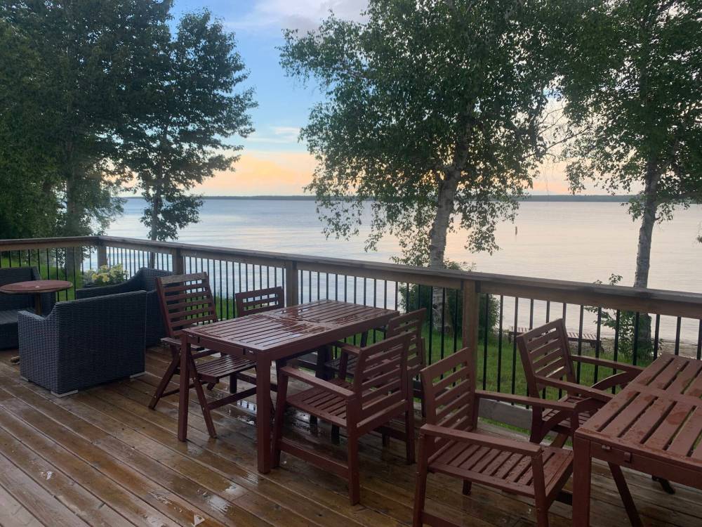The indoor dining area has floor-to-ceiling screened windows and there is adjoining outdoor deck; both provide spectacular views of the lake.