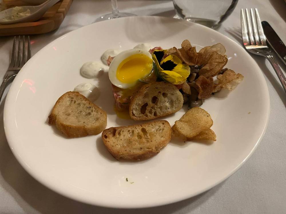 One of my favourite appetizers is steak tartare. I was surprised that when my plate arrived, it came with a quail’s egg, apparently the traditional way beef tartare is served in the province.