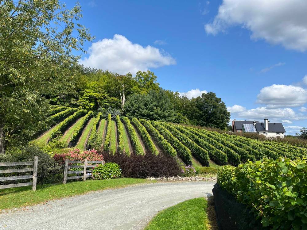 The vineyard currently produces Pinot Noir, Merlot, Cabernet Sauvignon, Chardonnay, Riesling, and Gewürztraminer and Vidal, but “has a patent pending technology to grow a large volume of Vinifera grapes varieties in Quebec, all possible due to a geothermal system.”