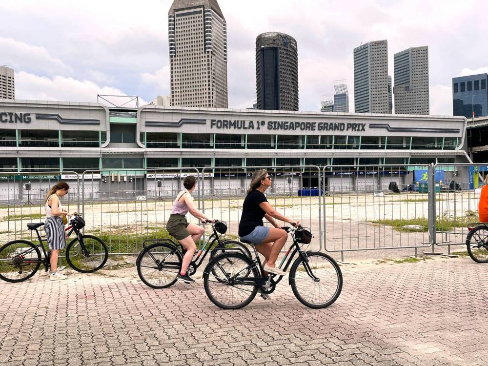 You see, our group of ragtag tourists is on Let’s Go’s Historical Singapore Bike Tour and one of the highlights is cycling at the starting line of the Formula 1 Singapore Grand Prix.