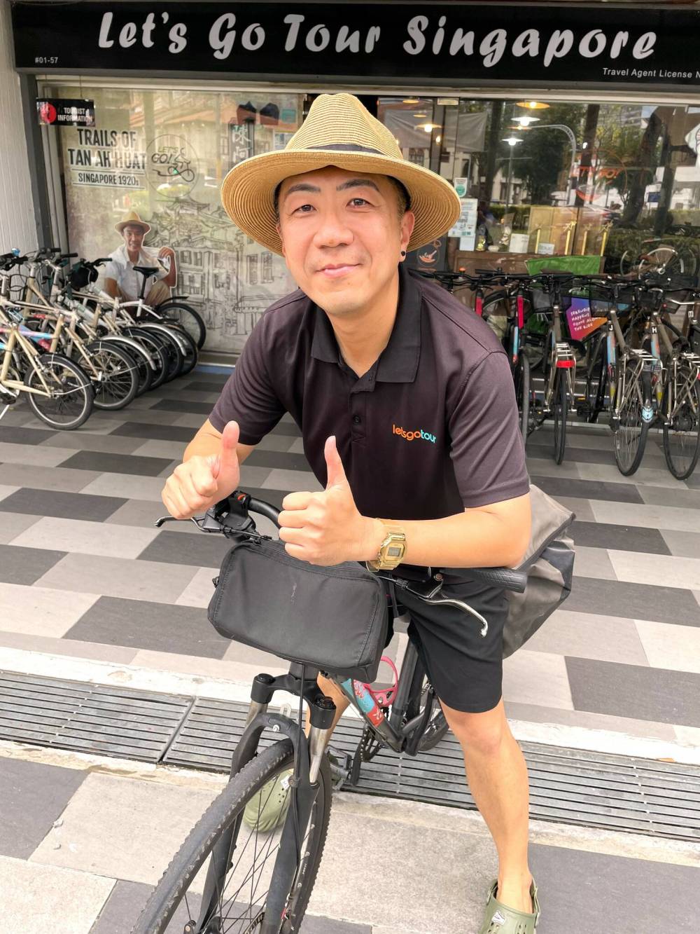 Over the four-hour, 14-kilometre tour, Yap will make other humorous quips to keep us entertained and informed as we cycle past the shophouses and back alley bars of Kampong Glam, through the Civic and Central Business districts, along the Singapore River and around Marina Bay.