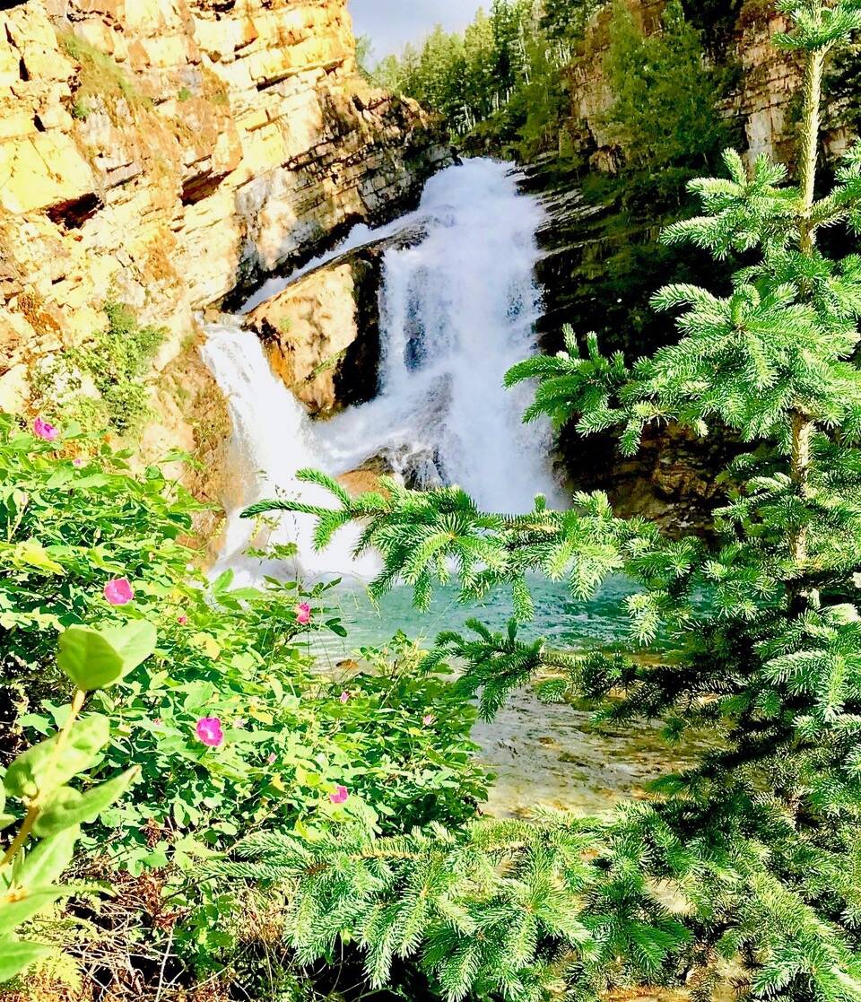 Nearby we found the Village’s photogenic Cameron Falls. Margie’s sunglasses disappeared from her pocket as she balanced atop a fence and against a rockface to take a picture. An Edmonton couple exclaimed, “We walk here every morning!” They didn’t even appear tired. Leaving, I saw them balancing for the same photo angle. Readers should visit — even if to collect lost items.