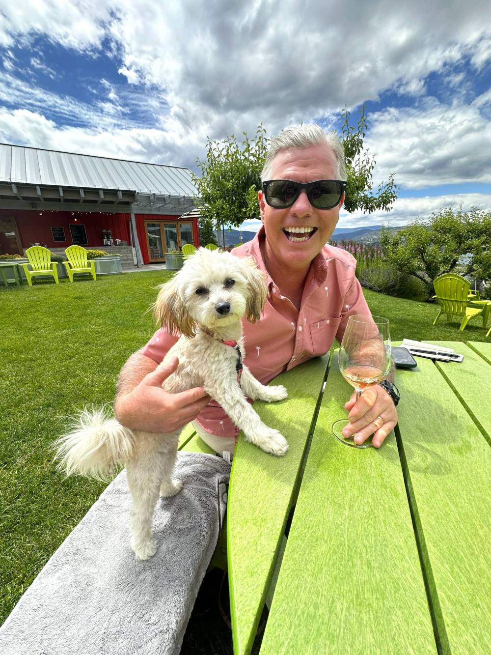 Travel writer Steve MacNaull and his pup, Daisy, enjoy a glass of Rose at Joie Farm Winery.