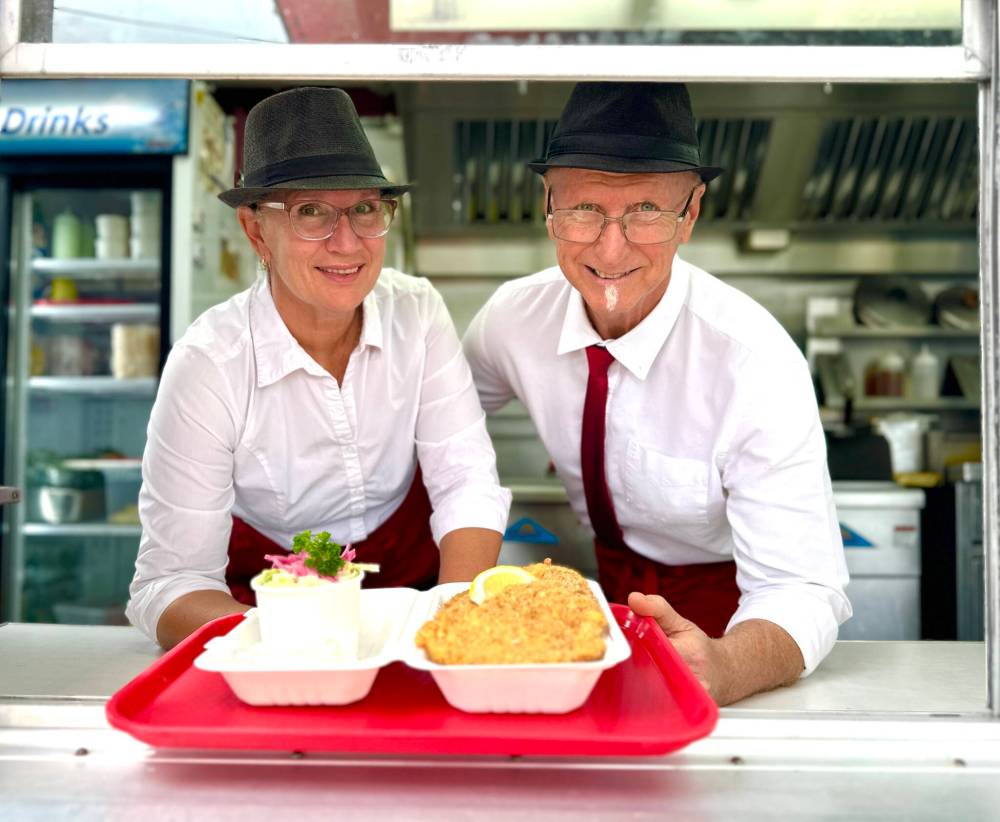 Shel Zolkewich photo Nathalie and Chef Jozef cheerfully serve mouth-watering wiener schnitzel from Jennifer’s Picnic in Seven Sisters. Grab your meals and head to Whitemouth Fall Provincial Park for dinner and a show.