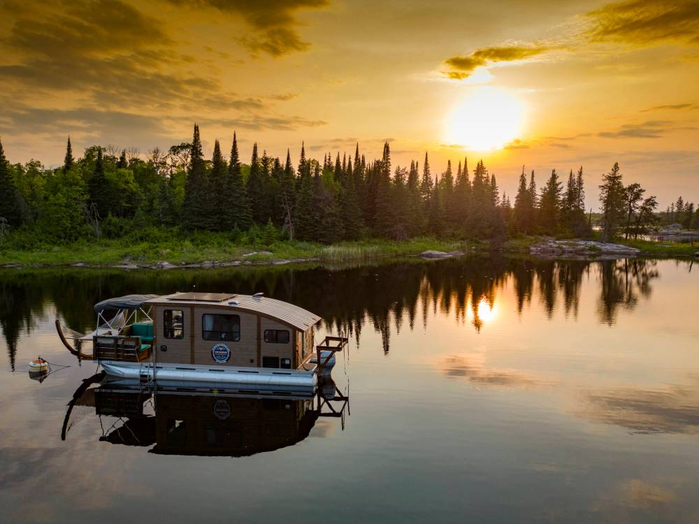 Voyageur Houseboats photo Drift off to sleep in a quiet bay in a Voyageur Houseboat. These luxury accommodations launch from Pinawa and also offer evening tours-some with charcuterie.