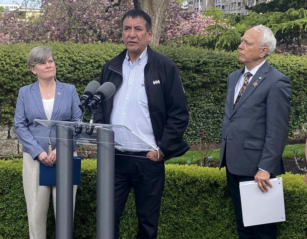 Chief Harley Chingee of B.C.’s McLeod Lake Indian Band talks to media in Victoria, B.C., Wednesday, May 3, 2023, as Indigenous Relations and Reconciliation Minister Murray Rankin and Josie Osborne, energy, mines and low carbon innovation minister, look on. THE CANADIAN PRESS/Dirk Meissner
