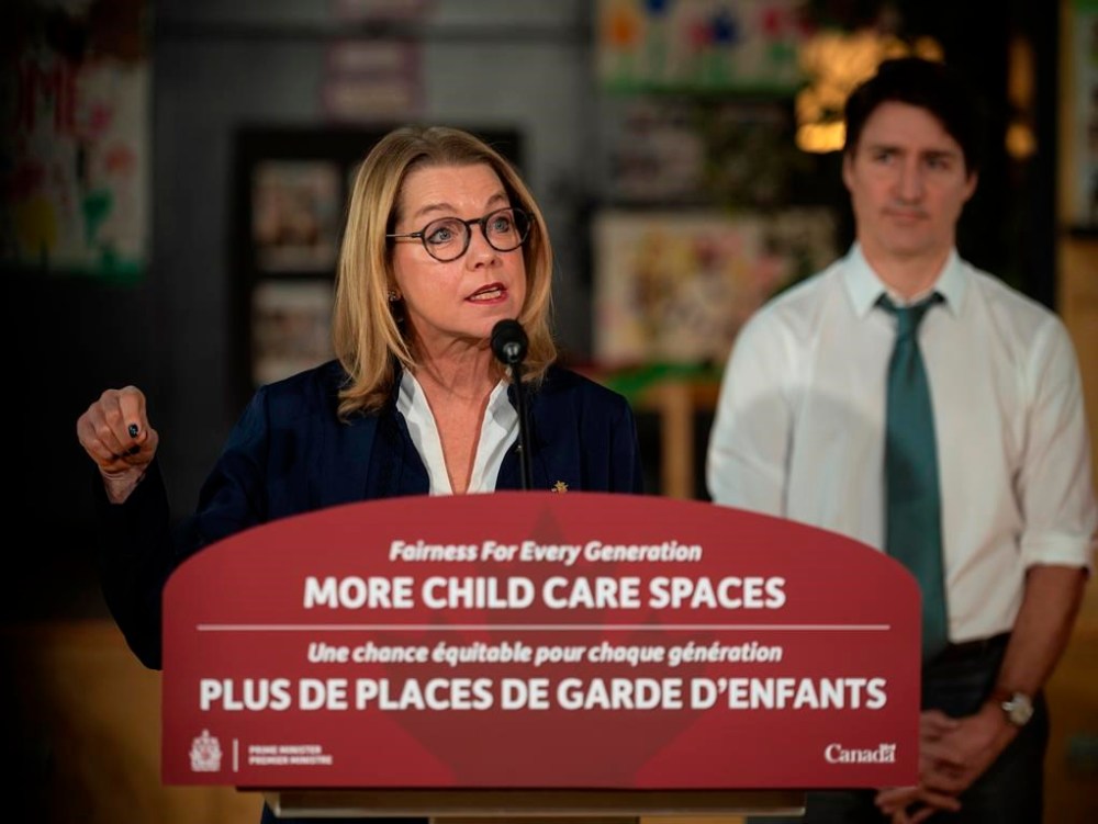 B.C.'s Minister of State for Child Care Mitzi Dean speaks during a press conference alongside Prime Minister Justin Trudeau in Surrey, B.C. on Thursday, March 28, 2024. THE CANADIAN PRESS/ Tijana Martin