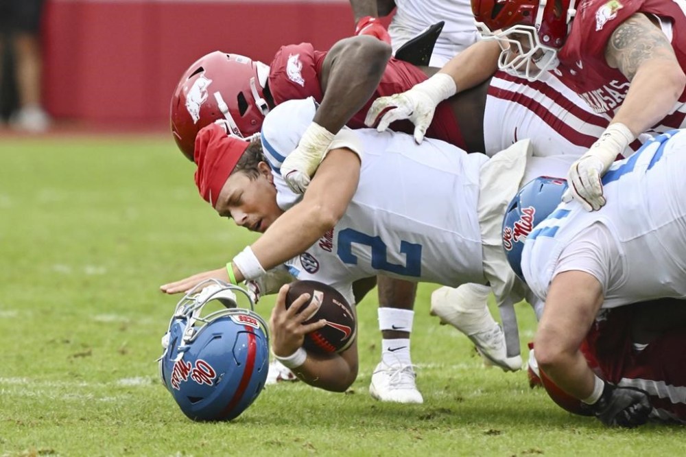 Arkansas (5-4, 3-3 SEC) had stuffed the Rebels at the goal line on the Rebels’ first drive for about the only meaningful stop the Razorbacks had all game. Ole Miss racked up 694 yards of total offense. In all, Ole Miss scored on seven of its nine possessions with its starters in the game, only punting once in that span.