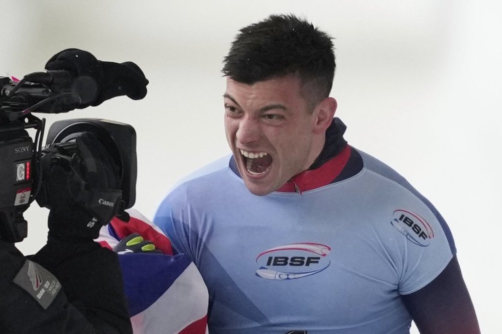 Britain’s Matt Weston finishes a dominant run to the men’s skeleton world title in Lake Placid