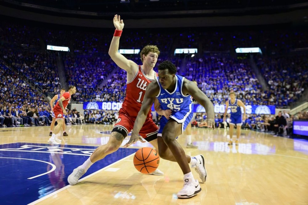 BYU center Fousseyni Traore (45) drives to the basket guarded by Utah forward Caleb Lohner (11) during the first half of an NCAA basketball game Saturday, March 8, 2025, in Provo, Utah. (AP Photo/Tyler Tate)