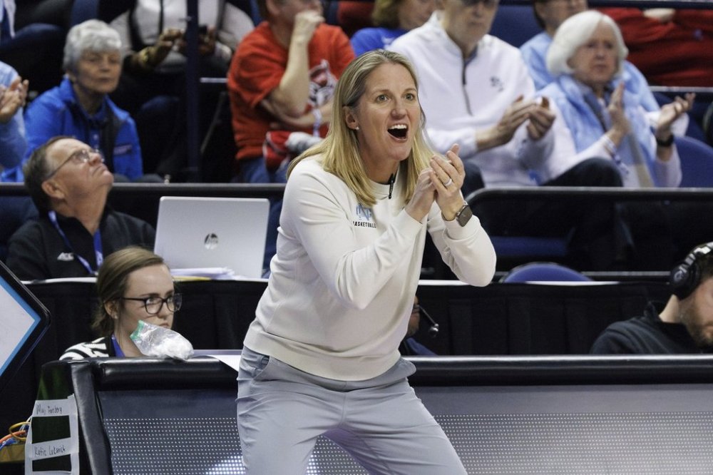 North Carolina head coach Courtney Banghart claps during the first half of an NCAA college basketball game against North Carolina State in the semifinals of the Atlantic Coast Conference tournament in Greensboro, N.C., Saturday, March 8, 2025. (AP Photo/Ben McKeown)