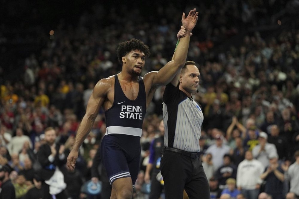 PHILADELPHIA (AP) — Penn State’s Carter Starocci won an unprecedented fifth national title and Oklahoma State’s Wyatt Hendrickson stunned Olympic gold medalist Gable Steveson 5-4 in the heavyweight final Saturday night at the NCAA men’s wrestling championships with President Donald Trump in attendance.
