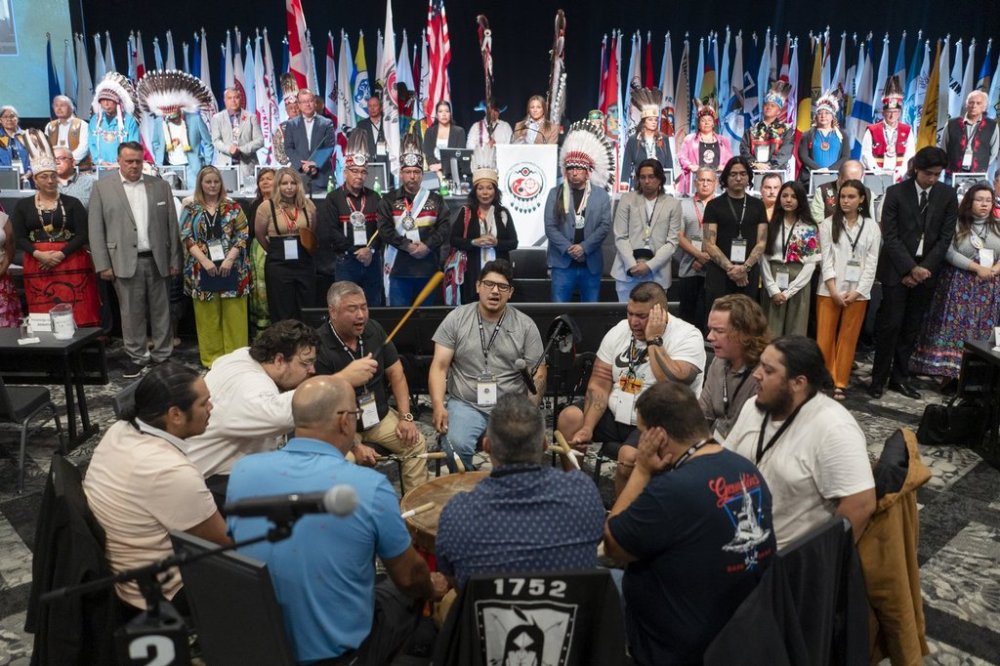 The Eastern Eagles Mi'kmaq drumming group performs at the beginning of the Assembly of First Nations annual general assembly in Halifax on Tuesday, July 11, 2023. THE CANADIAN PRESS/Darren Calabrese