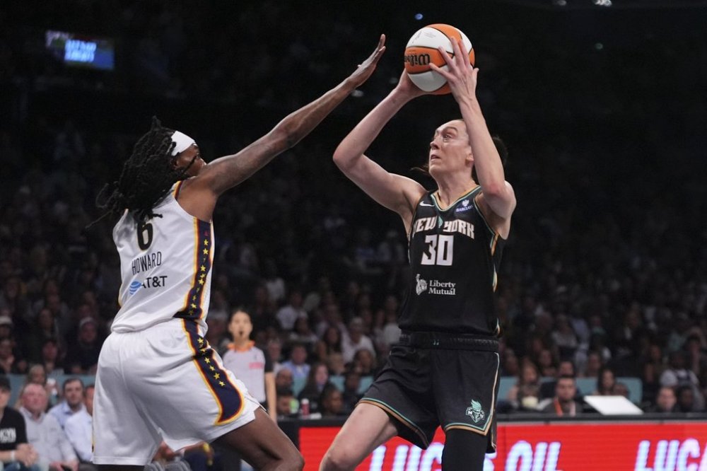 New York Liberty's Breanna Stewart (30) shoots over Indiana Fever's Natasha Howard (6) during the first half of a WNBA basketball game Wednesday, July 16, 2025, in New York. (AP Photo/Frank Franklin II)