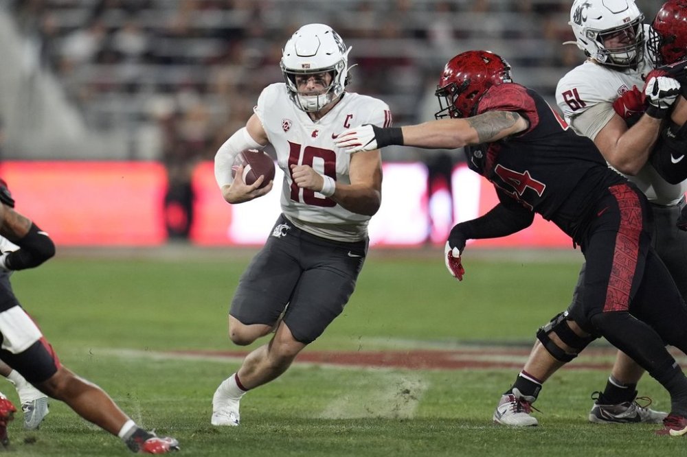 FILE - Washington State quarterback John Mateer runs with the ball during the first half of an NCAA college football game against San Diego State, Oct. 26, 2024, in San Diego. (AP Photo/Gregory Bull, File)