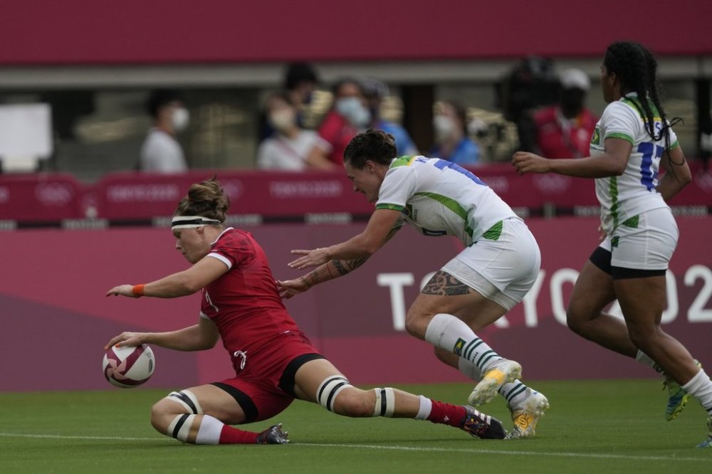 Canada's Karen Paquin, left, scores a try past Brazil's Raquel Kochhann, centre, and Thalita da Silva Costa in their women's rugby sevens 9-12 placing match at the 2020 Summer Olympics, Friday, July 30, 2021, in Tokyo, Japan. (AP Photo/Shuji Kajiyama)